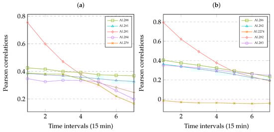 Correlations in multiple links. (a) Time intervals on Link AL281. (b) Time intervals on Link AL282.