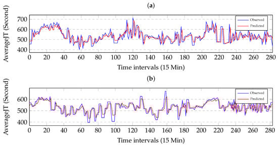 Effectiveness of the prediction under the different traffic conditions. The horizontal axis is time interval and the vertical axis is travel-time. (a) Comparison between the observed values and the predicted values on Link AL282. (b) Comparison between the observed values and the predicted values on Link AL281.
