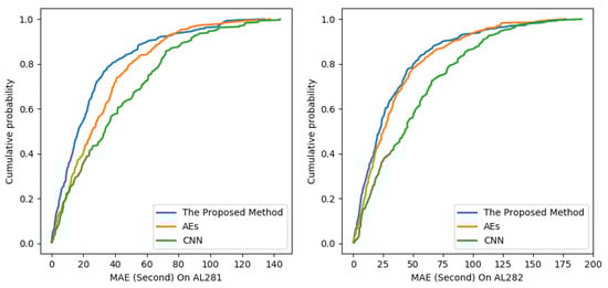 Figure 9 plots the cumulative distribution functions of the absolute prediction errors on links AL281 and AL282 to demonstrate the statistical property of the proposed method, CNN and AES, respectively. The time interval is 15 min. Figure 9 shows that the prediction error of the proposed method is smaller than CNN and AEs on link AL281 and link AL282. In summary, the experimental results testified the effectiveness of the proposed method for travel-time prediction.