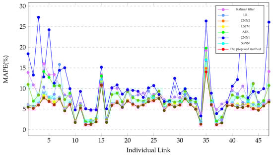 Experimental results of the proposed method and the baseline methods on individual links in terms of MAPE. The best results in the table appear in bold.