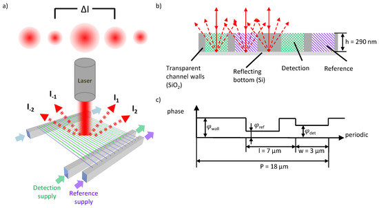 Figure 1c describes the asymmetry of the grating and the relating phase shift in the detection channels (), the reference channels () and the transparent channel walls (). Here, P denotes the period of the optical grating, l describes the shift from the symmetric position and w denotes the nanochannel width. As the depth of the channels h is constant as well as the wavelength of the incoming and outgoing light (with k = 2 ), only the refractive index n of the channels will affect the phase shift and therefore the intensity distribution of the diffraction pattern. The phase shift of the transparent walls stays constant. The asymmetric structure of the grating unit cell gives rise to an asymmetric intensity distribution in case of a refractive index difference between reference and detection channels, . For a symmetric grating the intensity of both the same order maxima would be always equal. The intensity values of the single maximum are used to generate the signal :