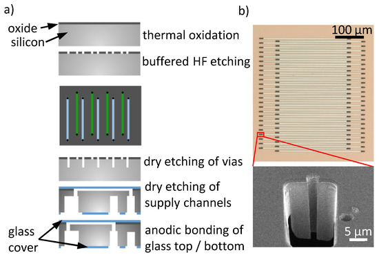 (a) Schematic illustrating the fabrication. (b) Optical micrographs of the nanofluidic grating. At the end of each nano channel, a via connects the channel to bigger supply channels. Also shown is an electron microscopy micrograph of a focused ion beam (FIB) cut through one via.