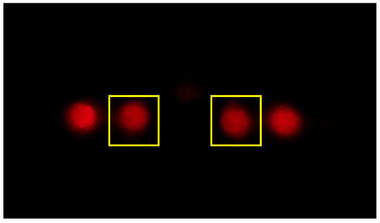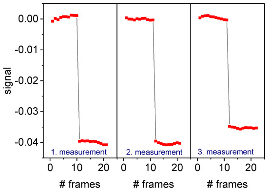 In addition to ISO settings and exposure time, the time between two images and the number of images can be defined. In the experiments described here, an interframing time of 2.5 s and 20 images for each measurement section were selected. The images were then saved and the user can define positions of the maxima to be evaluated by a simple double-click on each maximum. Within a certain region of interest ( pixel) around each maximum all pixel values were integrated. Finally, the signal was calculated according to Equation (2). The reference state then yields the baseline and the average difference from the second measurement part to the baseline gives the relevant signal strength. For comparison, the recorded images were also analyzed with a Matlab program. The moving average of the signal was calculated (window length = 10).
