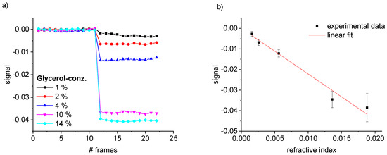 Signal of the first mode maxima and its dependency on refractive index changes. (a) Plot of the signal vs. number of consecutively recorded frames. For the first 11 frames, DI water ran through all channels and the resulting signal was set as a baseline. In the following phase, DI water with different glycerol concentrations was injected into the detection channels. (b) Calibration curve as a function of .