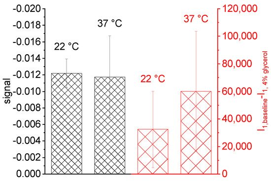 One aim of POC devices is to enable medical support independent of laboratory facilities or medical environment. As the refractive index is very sensitive to changes in temperature, adequate common mode rejection between the detection and reference channels is essential to avoid misinterpretation of the signal. Here, we show that the asymmetric structure of our nanofluidic grating allows the direct optical subtraction of such common changes without the need for additional reference measurements. We performed several measurements with 4% glycerol solution and DI water as reference at room temperature (22 C). Afterwards we placed the complete setup into an incubator and waited until the setup had reached a temperature of 37 C. We then repeated the glycerol/water measurements under the higher temperature conditions and plotted the signal as well as the difference in intensity of a single maximum between baseline and the high refractive index phase for both temperature levels, (baseline) −(4% glycerol), in Figure 8. The intensity of the single maxima shows a clear shift due to the change in temperature indicating the effect of temperature on the refractive index. However, the left part of Figure 8 shows that the impact of temperature can be suppressed in the measured signal. The signal shows very similar values for both temperature levels, even though the standard deviation increases for the higher temperature. This might again be due to the fact that the optical path was not temperature-controlled. Nevertheless, the average difference between the signal of both temperature levels corresponds to RIU, which is one order of magnitude smaller than the change in refractive index of water from temperature T1 to T2 [33].