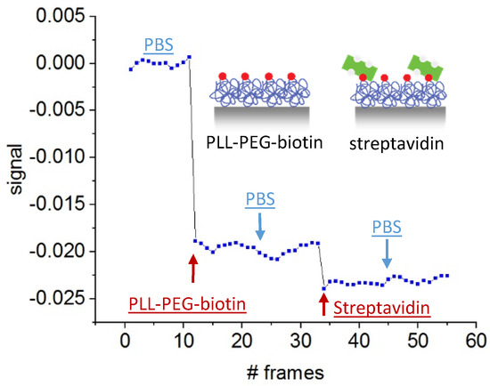 Functionalization and detection of poly-l-lysine(20)-g[3.5]-polyethylene glycol(2)/polyethylene glycol(3.4)-biotin(50%) (PLL-PEG-biotin) in detection channels.