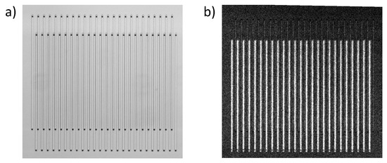 Each nanochannel was connected to bigger supply channels by small vias. The small vias allow us to address only the detection channels without affecting the reference channels. We opened 3 m vias by deep reactive ion etching (DRIE) and connected the nanochannels with bigger supply channels from the bottom side, which have also been processed by DRIE. Finally, all fluidic channels were sealed with Boroflaot 33 wafers by anodic bonding. The top glass wafer, sealing the optical grating, had a thickness of 200 m. The bottom glass wafer had a thickness of 700 m. Before bonding, through glass vias were opened by a femtosecond laser ablation to connect the chip to the fluidic interface. Figure 2 shows a microscope image of the optical grating consisting of nanochannels. Each channel has a width w = 3 m and a length of 320 m. In this study, we used a chip with an asymmetry of l = 7 m and a grating period of P = 18 m (cf. Figure 1).