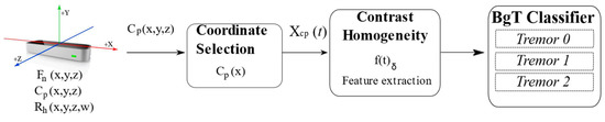 The strategy proposed for detecting a tremor in patients with Parkinson’s disease is shown in Figure 2. It consists of the following general stages: (1) data acquisition, (2) coordinate selection, (3) feature computation, (4) classification in three levels.