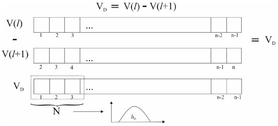 For simplicity, we adapt the spatial domain I (k, l) to the vector space V(l) in the time domain. In this approach, the V(l) vector is composed by n samples of the Cp(x) positions, acquired at 40 sps for 15 s and (l ϵ [1, n]) where n = 600. The difference vector (VD) is obtained by subtracting each data point and its neighbor, separated by a displacement (M), in this case M = 1, i.e., the previous sample. Afterward, we specify the region D as a subset of indexes defined by the window size N in which the texture features will be calculated, where N = Card{D}. The difference histogram (hD) is calculated from (VD). In this case, VD represents the number of times that x position appears in the difference vector over the domain D. Figure 4 shows the process to obtain VD and hD. Similarly, the sum vector (VS) and the sum of the histogram (hS) is calculated.