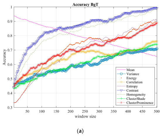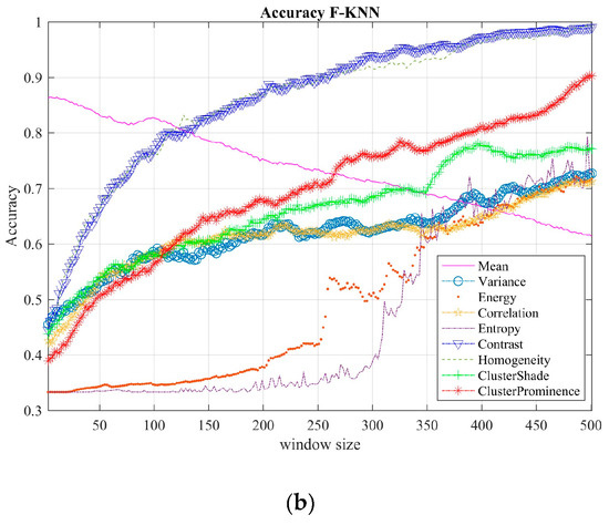 Thus, feature selection consists of testing both classifiers for each texture feature mean, variance, correlation, contrast, homogeneity, cluster shade, and cluster prominence using different window sizes (from 3 to 501). Plots in Figure 5 show the performance comparisons among the texture features, using the bagged tree, as shown in Figure 5a, and F-KNN classifier, as shown in Figure 5b.