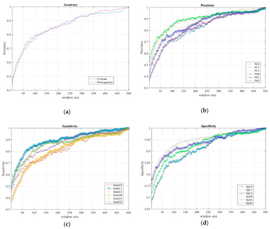 Plots a–d in Figure 6 show the accuracy (Acc), precision (P), sensitivity (Sens), and specificity (Sp), respectively, for contrast and homogeneity features as the window size increases. Note that metric values improved as window size increased for both features. In the next section, we show these metrics for only three window sizes to illustrate specific classification results in detail.