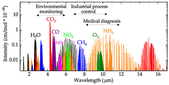 Gas sensors are used in a variety of scientific, industrial and commercial applications [1]. Among various sensing techniques [2], sensors based on the interaction of light with gas molecules [3], can offer high sensitivity [4,5], and long-term operation stability [5]. In addition, they have longer lifetimes and shorter response times [3,6], compared to other techniques [2], making them suitable for real-time [7], and in situ [8] detection. Most optical gas sensors rely on absorption spectroscopy [3], where a gas is detected by measuring the light absorbed (due to its interaction with the gas) as a function of wavelength [9]. Many important organic and inorganic molecules [9] have characteristic absorption lines in the mid-infrared (MIR) spectral region ( 2–20 m) (Figure 1) [10], corresponding to fundamental vibrational and rotational energy transitions [9]. The MIR fundamental transitions have stronger line strengths than their overtones, typically used in the visible and near-IR regions [9,10]. In addition, spectra are less congested, allowing selective spectroscopic detection of many molecules [9,10]. This molecular “fingerprinting” capability makes MIR gas sensors highly desirable for an increasing number of applications involving chemical analysis, such as industrial process control [11,12,13], environmental monitoring [14,15], and medical diagnosis [16].