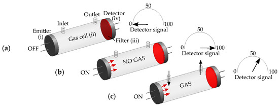 Optical gas sensor based on the Beer–Lambert’s law. (a) No signal detected when the emitter is off. (b) The detected signal is at a maximum when the emitter is on and no gas is present, and is decreasing (c) with the gas concentration, c, when the gas is present.