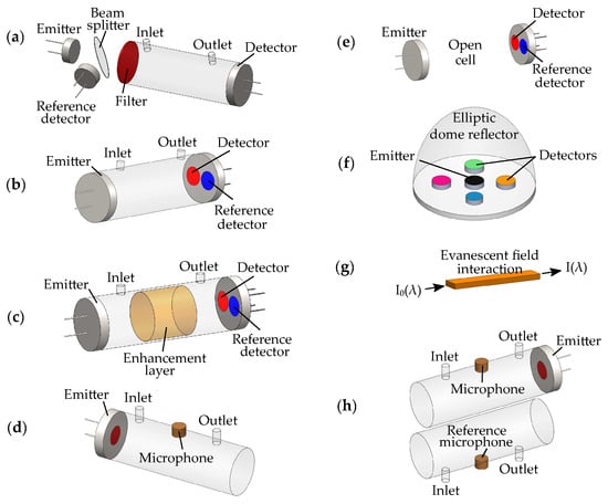 Optical gas sensors topologies. Most commonly used sensors rely on gas cells formed between face-to-face configured emitters and detectors. (a) Light can be filtered prior interaction with the gas. An external reference detector can be used to compensate for changes in the emitted light [53]. (b) Dual detector configuration, with [48,58] or without [54] filters. (c) The gas cell can be reduced by increasing the light-gas interaction, e.g., by using photonic crystals [55], optical cavities [56], multi-pass cells [57], or gas enrichment layers [58]. (d) Photoacoustic cell. Acoustic waves created by light-gas interaction are detected by a microphone. It can be resonant [67] or non-resonant [68]. (e) Open cell configuration, using either dual optical detection [64] or microphones sealed with target gases [69]. (f) Cell with emitter and detector in planar configuration. Multiple optical detectors with filters in the range of interest can be used [59], or microphones sealed with target gases [44]. (g) Waveguide sensors based on evanescent field interaction [60,61,62] require optical coupling with both emitters and detectors. (h) Dual photoacoustic cell with reference microphone [70,71,72].