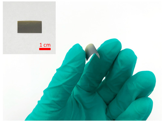 The nanocomposite hybrid is prepared by a standard solution mixing process, in which 0.05 g graphene (~1 nm in thickness, 50 mm in diameter, SSA ~ 1200 m2/g, purity > 99 wt.%, Suzhou Tanfeng Graphene Technology Co., Ltd., Suzhou, China) is mixed with 0.95 g PVP (PVP K-30, Sigma-Aldrich, St. Louis, MO, USA) in 40 mL ethanol (≥99.8%, Honeywell, Charlotte, NC, USA). The dispersion of graphene and PVP is mechanically stirred for two hours at the rate of 400 rpm, after which the hybrid is sonicated in a sonication bath (Brandson 5800 Ultrasonic Cleaner, 40 kHz, Emerson, St. Louis, MO, USA) for one hour. Polyimide (PI) films with the thickness of 25 μm are chosen as the substrate, due to the good flexibility and chemical stability of PI, making these sensors stable and compatible with different structural surfaces. The prepared hybrid is sprayed directly onto the PI film by an airbrush (HD-130), forming a sensor film with thickness of ~5 μm on the PI substrate. An optical photograph of the spray-on graphene/PVP sensor is presented in Figure 1.