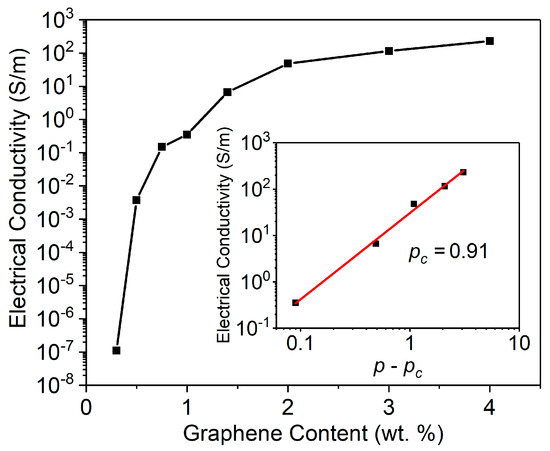 To ascertain the percolation threshold of the spray-on sensor, the spray-on sensors are fabricated with different weight ratios of graphene ranging from 0.3 to 4.0 wt.%. The electrical resistance () is measured using a dynamic digital multimeter (Keithley DMM 7510, Tektronix, Beaverton, OR, USA), and contact resistance of the electrodes is negligible, compared with the resistance of the printed sensor, which is of an order of tens of kΩ. The conductivity () is calculated according to , where and are the distance between two measuring electrodes and the cross-section area. The relationship between and the content of graphene is shown in Figure 2. As evident in Figure 2, a remarkable increase in electrical conductivity can be observed when the graphene content is between 0.5 and 1.0 wt.%. With the power-law function linear fitting based on Equation (1), the percolation threshold can be determined as 0.91 wt.%. From the percolation threshold results (0.91 wt.%) determined by percolation theory, a spray-on graphene/PVP sensor with 1.0 wt.% graphene is selected for further investigation.