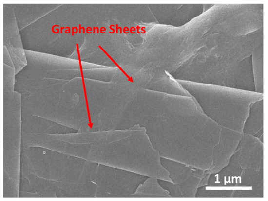 The morphology of the spray-on graphene/PVP is characterized using a scanning electron microscope (SEM, JEOL JSM-6490, JEOL, Ltd., Akishima, Japan). Figure 3 presents an SEM image of the spray-on graphene/PVP sensor with 1.0 wt.% graphene. Graphene sheets are sparsely distributed in the PVP matrix, and the 2-D sheets are uniform without entanglement and aggregation, indicating good dispersion of graphene nanofillers in the nanocomposite structure.