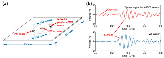 (a) Schematic of experimental setup for guided ultrasonic wave (GUW) sensing calibration; (b) GUW signals captured by the spray-on graphene/PVP sensor and the PZT wafer.