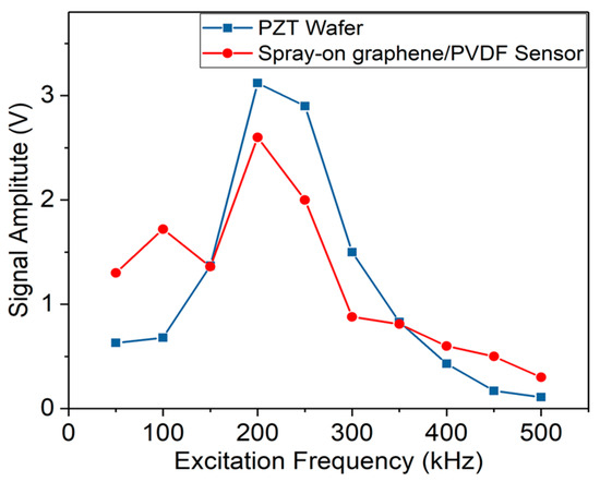 GUW signal amplitude (S0 mode) of spray-on graphene/PVP sensor and PZT wafer under excitation frequencies of 50–500 kHz.