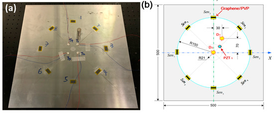 (a) 6061T aluminum with the spray-on graphene/PVP sensors and a PZT wafer; (b) locations of the actuator, sensors, and damage (unit: mm).