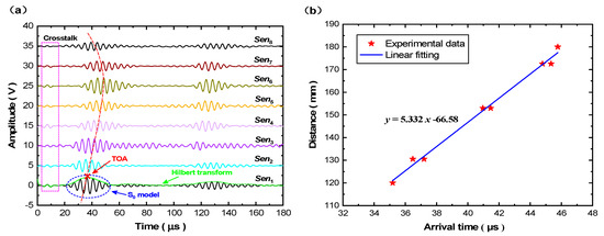 (a) GUW signals acquired via all the sensing paths without damage; (b) group velocity of S0 mode calibrated by linear fitting.