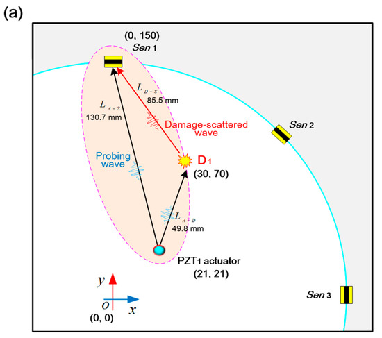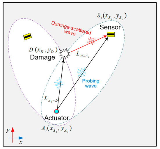 In the above, , and denote the distances between the actuator and the damage center , the damage center and sensor , and the actuator and sensor, respectively. is the group velocity of the incipient S0 mode. (i.e., ToF) is to be determined from the GUW signal captured by sensing path . By solving Equation (2) with the knowledge of , , and , an elliptical locus with two foci at the actuator and sensor can be ascertained (see Figure 10), implying all the possible locations of damage in this sensing path. With more elliptical loci from all the sensing paths, the damage location can be represented by the intersection of ellipses.