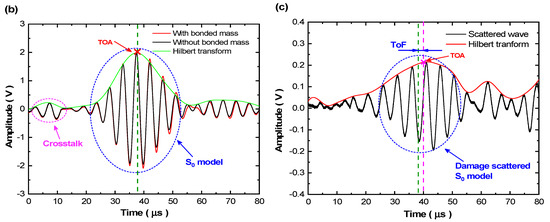 (a) Relative position of the actuator PZT1, sensor Sen1, and damage D1 for the sensing path PZT1-Sen1; (b) representative GUW signals acquired via the path PZT1-Sen1 before and after introducing damage; (c) scattered wave extracted from these two GUW signals.
