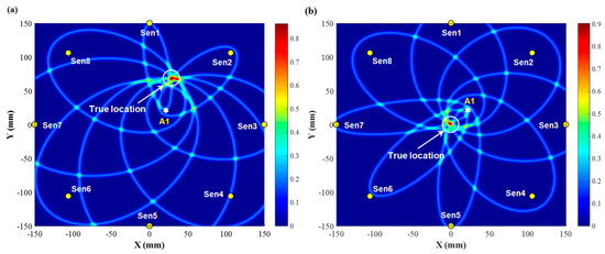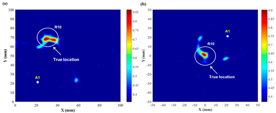 Diagnostic image obtained using the ToF-based PDI algorithm: (a) damage at (30 mm, 70 mm); (b) damage at (0, 0).