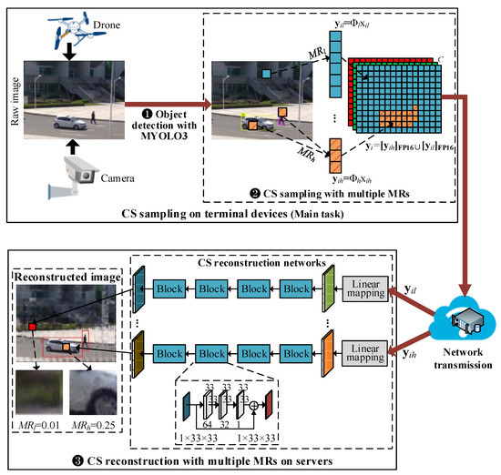 Therefore, we propose a low-cost image CS approach called MRCS, which employs multiple Measurement Rates (MRs) for object detection applications in real scenarios. MRCS aims to reduce the sample data’s overheads of network transmission and storage space. It also aspires to preserve adequate image features of key regions in object detection-based scenarios such as ’Who is the person in the surveillance image?’. MRCS comprises of three stages: object detection, CS sampling with multiple MRs on terminal devices, and CS reconstruction on remote servers. To accelerate object detection on resource-constrained surveillance devices while improving the accuracy of object detection, we propose a smaller object detector architecture named MYOLO3. It is a one-stage objector that achieves the trade-off between the accuracy and number of operations measured by multiply-adds. Then, for an image/video frame, the key regions that users are interested in are sampled with higher MRs to preserve image features, while other regions are sampled with lower MRs in order to reduce the amount of measurement data. Finally, the natural images for object detection are reconstructed using CS measurements sampled with multiple MRs, which is employed as a post-acquisition step on high-performance servers [8].