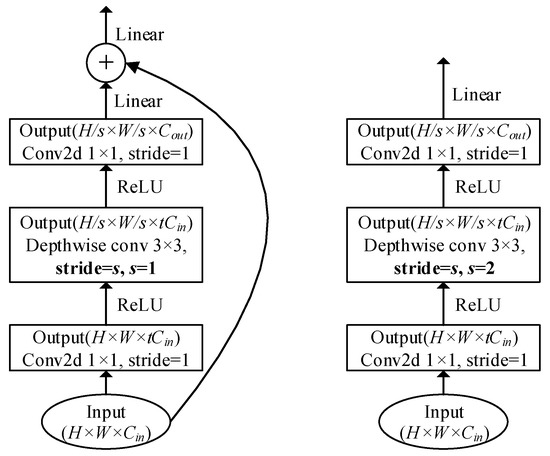 As illustrated in the left side of Figure 2, when the stride is 2 for the depthwise convolution, a shortcut connection is used to connect the beginning and end of the bottleneck residual block. The linear activation function is used in the last layer and after the addition operation instead of the ReLU function, since the linear transformation prevents the ReLU transformation from destroying too much information [40].