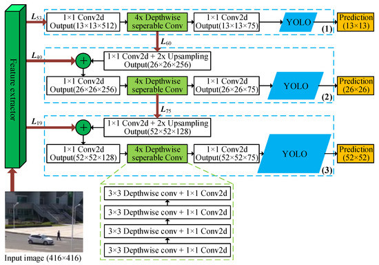 As shown in Figure 3, the depthwise feature pyramid network consists of three sub-detectors. Each sub-detector begins with a standard convolutional layer with filters, following four depthwise separable convolutions, a standard convolution with filters and a YOLO layer. The YOLO layer performs detection predictions (e.g., coordinates of bounding boxes and class labels) [24]. The remaining layers (e.g., upsampling layers and route layers) are responsible for upsampling and concatenating feature maps to produce the input feature maps for the latter two sub-detectors. The number of filters used in the last convolutional layer (e.g., the 63rd, 69th and 93rd layer) of each sub-detector is determined by the number of detected object classes, which is denoted by the parameter in Table 1. As the following experiments are executed on the VOC dataset containing 20 classes (e.g., ). Thus, the number of the filters in three YOLO layers is obtained as , which is identical with the number of output channels for these convolutional layers.