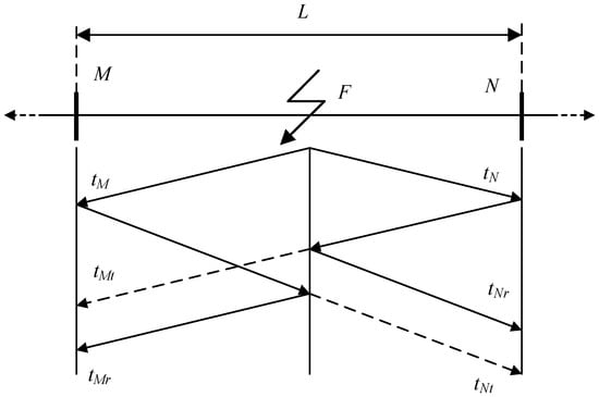 Based on Equation (1), ideally, the traveling-wave process can be shown in Figure 1, where M and N represent the two ends of the transmission, or power, line; L represents the length of the power line; F represents the location of the fault; tM represents the time at which the fault traveling wave reaches M; tN represents the time at which the fault traveling wave reaches N; tMr represents the time when the first reflection wave, i.e., the wave reflected from the fault site, reaches M; tNr represents the time when the first reflection wave reaches N; tMt represents the time when the first refraction, i.e., the wave refracted from the fault site, wave reaches M; tNt represents the time when the first refraction wave reaches N.