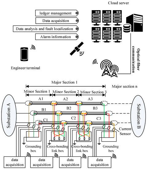 The sheath current monitoring system is presented in Figure 3, where a typical cross-bonded HV cable is shown as an example. The sheath current monitoring system contains four parts, namely, the data acquisition module, the communication module, the location analysis software installed in the cloud server, and the interface for the final users, e.g., cable maintenance engineers. The data acquisition module (including the sheath current sensors) are employed at the grounding boxes and the cross-bonding link boxes. When a fault happens in a cable section, the sheath current in the loop where the fault happens will rise to the level of fault current. Meanwhile, the data acquisition module will be woken up and start data uploading. The communication module of the data acquisition system can transmit the recorded data to a designated cloud server, where the location analysis software carries out data analysis before sending the location results to maintenance engineers. The recoded data can also be downloaded from the server for further analysis.