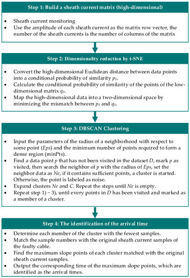 As shown in Figure 4, a high-dimensional space matrix needs to be built from information of all the monitored sheath currents, then the high-dimensional matrix can be mapped into a two-dimensional space by t-SNE (t-distributed Stochastic Neighbor Embedding) [17], which is a data visualization technique used for dimensionality reduction based on data characteristics. It is to be noted that the sheath current matrix built in step one can be two-dimensional or higher, and more data and higher dimensional matrix is recommended for the less randomness of the data. The t-SNE process not only reduces the data dimension, but also reduces the possible time deviation in the original data. The two-dimensional data is then clustered using DBSCAN, which is a density-based clustering algorithm. The possible noise in the data can be identified during the DBSCAN processing. Finally, the arrival times of the traveling wave can be identified using the cluster data. The specific four steps of the process are demonstrated in Section 4.1, Section 4.2, Section 4.3 and Section 4.4, with a simulation case.