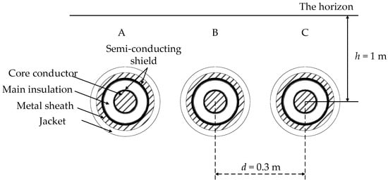 Typical power cables for high voltage (HV: Above 110 kV) have a single-core structure and for medium voltage (MV: 10~35 kV) a three-core structure, as shown in Figure 2a,b, respectively.