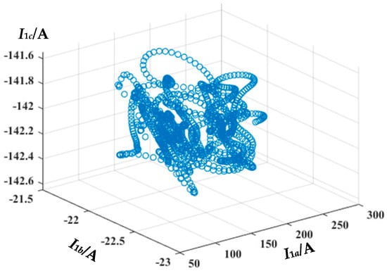 As shown in Figure 7, the sheath current of the faulty phase is easy to distinguish by the traveling wave. The three sheath current waveforms can be used to construct a three-dimensional matrix U ∈ RN×3, where N and d represent the number and dimension of samples, as plotted in Figure 8 for this case. In the simulation the sampling rate is 100 MHz and the sampling time is 12 μs, therefore N = 100 × 106 × 12 × 10−6 = 1200. The matrix U is the input of the t-SNE algorithm.