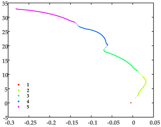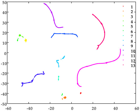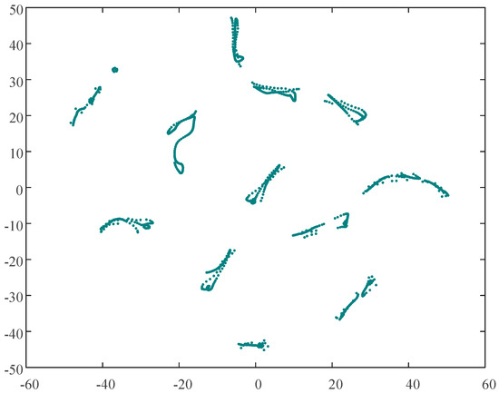 As shown in Figure 9, the scatter diagram of the two-dimensional map is more concentrated than the three-dimensional map shown in Figure 8: There is no obvious noise in either figure. It is to be noted that there are no legends on the axes of the two-dimensional map after t-SNE, for there are only mathematical meanings of the axes. The dots in Figure 9 are the dots of the original sheath current matrix optimized by t-SNE (similar to the “overlapping” process). The matrix V is the optimization result of the t-SNE algorithm, which means the matrix V is in closest agreement with Equations (6)–(9). Unfortunately, the physical meaning of the horizontal and vertical coordinates of the matrix V no longer exists after the t-SNE process. The matrix V is the input of DBSCAN (density-based spatial clustering of applications with noise) clustering.