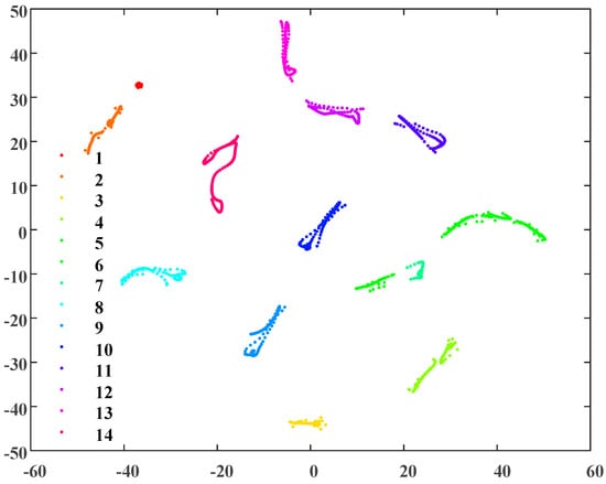 According to the two-dimensional map of Figure 9, there are multiple visible clusters: The distances between clusters are significant, the distances between the points of each cluster are small. For effective DBSCAN clustering in this example, Eps and MinPts are set to 0.1 and 7, respectively. The results of the clustering process, which resulted in fourteen clusters being identified, can be seen in Figure 10. As the sheath currents are sampled at equal intervals, the crests of the traveling waves are the signal with the maximum amplitude and with the fewest samples during the time interval. Once a fault happens to a cable (phase), the wave crests will also be induced in the sheath current of the adjacent cables (phases). Thus, the waveforms of the sheath currents are very similar, and these sampling points of the sheath currents are relatively concentrated in the distribution of the two-dimensional map after t-SNE.