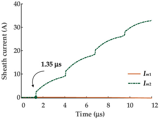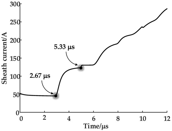 In Figure 12, the waveform has been recorded at the very time when the fault just occurred. As the fault simulated is of a penetrating breakdown, the sheath current waveform continues to grow during the first 12 μs. The regular propagation pattern of the electromagnetic wave was presented in Figure 6, with the first traveling wave arriving at 2.67 μs and the second arriving at 5.33 μs. As the traveling wave velocity is determined by the cable parameters, it can be calculated using Equation (10), where μ is the magnetic permeability and ε is the insulation permittivity.
