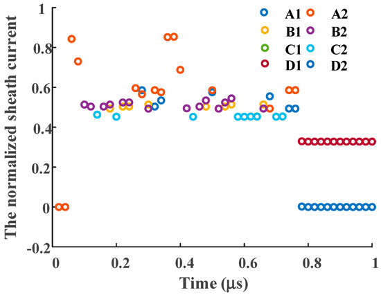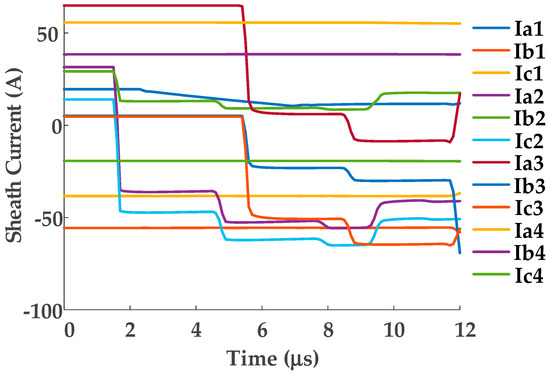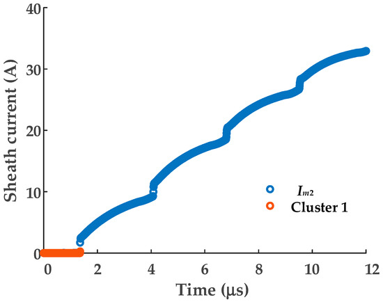 As shown in Figure 15 and Figure 16, there are 13 clusters: clusters 6 and 5 have the lowest number of samples. In this case, cluster 5 has a time for the maximum slope point of sheath current I1a of 2.03 μs, in cluster 6 the corresponding time of sheath current I2a is 1.35 μs. These are consistent with the expected times of the first traveling wave.