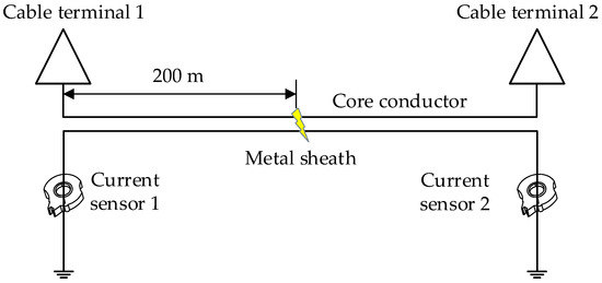 First, a model of a 1500 m cross-bonded 110 kV HV cable circuit was established using PSCAD. The cable parameters are the same as those presented in Table 1, while the schematic diagram of the cable circuit and the arrangement of the current sensors are presented in Figure 13. As shown, the major section of the cable circuit is 1500 m, and the major section is constituted by three minor sections, each 500 m long. The current sensors are located at the grounding boxes, G1 and G2, and the cross-bonding link boxes, J1 and J2. For this study, the cross-bonded cable circuit is also buried directly in the ground with horizontal laying, as shown in Figure 6.