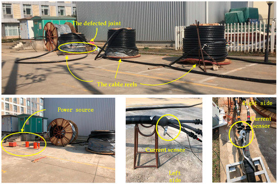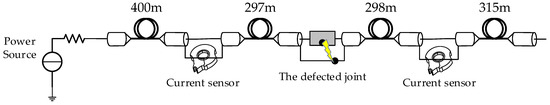 In order to test the effectiveness of the fault location method in practice, a fault location test was carried out on a MV cable circuit. The test cable platform, constructed from four reels of three-core XLPE cable (YJV22-8.7/15kV-3*240), was built at the Wuhan UHV (Ultra High Voltage) Test Base. All the cable sheaths have been grounded together at the terminal. The four reels of cable are connected in series to form a test circuit, shown schematically in Figure 22. The middle two sections (about 300 m each) constitute the monitored circuit. The middle two sections are connected by a manually constructed defective joint, and the six cable ends are connected by 10 kV cable outdoor terminals. On-site photographs are presented in Figure 23.