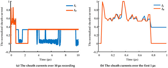 The test was carried out on a sunny winter day (24 January 2019). First, the manually constructed defective joint was connected in the cable and the current sensors were installed in the test circuit, as shown in Figure 23. A series resonant source is used to raise the voltage step-by-step until a breakdown occurs in the defective cable joint. During the process of raising the voltage there were several obvious discharges, visually and/or audibly observed, before the penetrating breakdown occurs. As the data sampling rate is high (50 MHz), the sampling time cannot be too long (dozens of microseconds). Normally, the first recorded data is used for fault location. However, as the buffer of the data recording device is not designed for long time sampling, i.e., the length of time to raise the voltage step-by-step, incorrect operation or continuous discharge may rewrite the buffer with data from subsequent discharge events. To illustrate the superiority of the fault location method, the discharge waveforms of the subsequent data have been recorded. The recorded discharge waves, using normalized amplitudes, are presented in Figure 24: IL and IR are the currents recorded by the sensor to the left and right hand of the fault, respectively.
