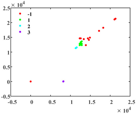 As shown in Figure 24, although the subsequent waveforms slightly deviate, the first crest of the recorded discharge signal waveforms of IL and IR are substantially coincident. This indicates that the time of arrival of the traveling waves at the monitoring positions is basically the same, and the fault is located at the midpoint of the electrical distance between the two monitoring positions. The DBSCAN clustering results of IL and IR are presented in Figure 25, where points labeled as -1 represent noise, and those labeled 1~3 represent three types of data points, respectively. The scatter diagram of the clustering data of IL and IR is replotted in Figure 26.
