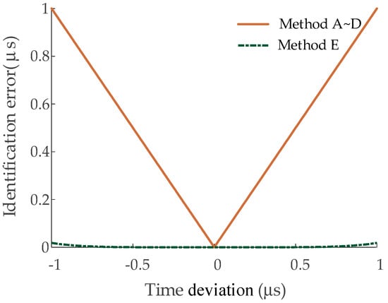 The performances of methods A~E with a time error added to I1a. (The ordinate axis represents the absolute value of the identification error).