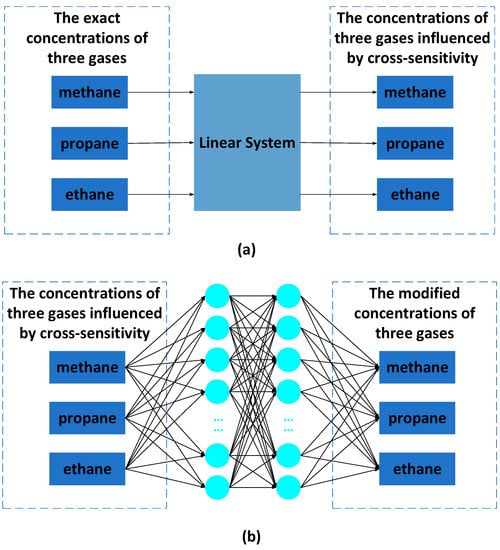 Two types of mixed gases recognition systems: (a) is a linear system, in which the outputs of the concentrations of the three gases are influenced by cross-sensitivity; (b) is a neural network (NN) recognition system, in which the outputs are close to the exact concentrations.