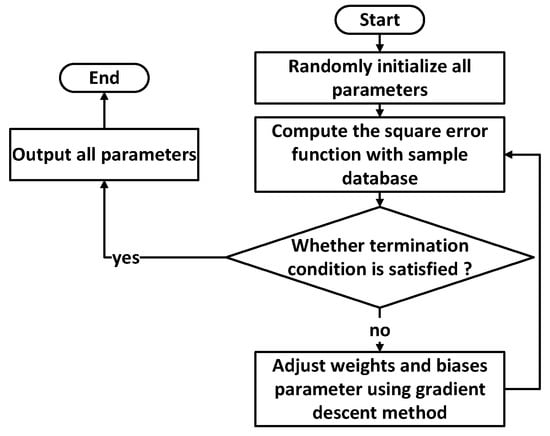 A multilayer layer perceptron NN (MLP NN) can learn and store a large number of input–output mode mapping relations without revealing the mathematical equations describing the mapping relations beforehand. Through experimental testing, a large-scale dataset of three-input and three-output experimental samples can be constructed. Then the data sample library is used to train the NN to achieve the recognition accuracy required by the design. Our NN consists of one input layer, two hidden layers and one output layer. The input layer has 3 neurons; the first hidden layer has 10 neurons; the second hidden layer has 20 neurons; the output layer has 3 neurons. We use a back-propagation algorithm to train the MLP NN. MLP NN training consists of two processes: forward propagation of data flow and backward propagation of error signals. The direction of positive propagation is input layer, hidden layer and output layer, which is shown in Figure 2. The flow chart of the MLP NN training algorithm is shown in Figure 3, which describes the steps in the process of training the NN. The concrete steps of the process are described as follows: