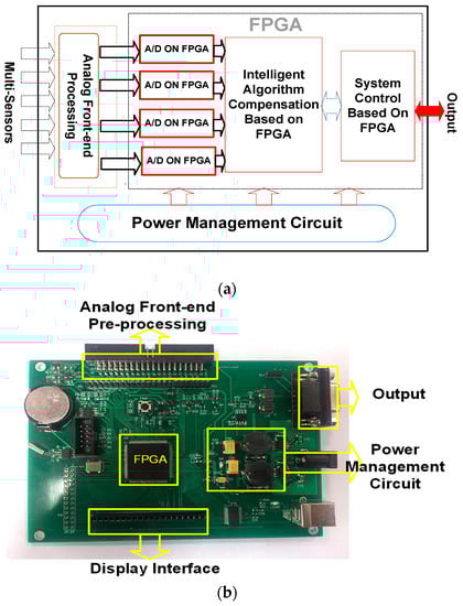 (a) Diagram of the circuit system framework of the mixed natural gas online testing system, in which the FPGA is the core of the intelligent algorithm and control module; (b) Processing circuit, in which the FPGA plays an important role. The FPGA is used to implement the NN algorithm and system control.