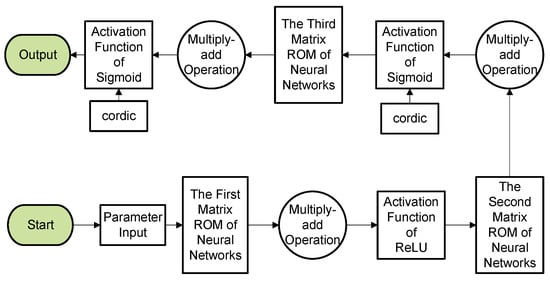 The Intelligent Learning Algorithm is the key module of the MLP NN algorithm implemented by hardware. Before the algorithm is conducted, the input signal of the sensor is converted to hexadecimal from a 32-bit floating-point. FPGAs contain an array of programmable logic blocks, and can be reprogrammed for different logic functions, allowing flexible reconfigurable NN computing as performed in computer software. The data obtained by the sensor is input from the input layer, then the parameters are extracted from the ROM to the conductor multiply add operation, and then input into the activation function. The subsequent processing of the hidden layer and the output layer is similar to that of the input layer. Figure 5 shows the flow chart of the algorithm, which mainly includes the implementation of the three-level matrix multiplication and activation function. Processing of the hidden layer and the output layer is similar to that of the input layer. The weight matrix parameters are stored in ROM. The analytic equations of the ReLU and Sigmoid functions are shown in Equations (1) and (2), respectively. The ReLU function could provide a fast training speed. The Sigmoid function has the advantage of high precision, but it has expansive computational costs. So, we combine the two functions to obtain best results.