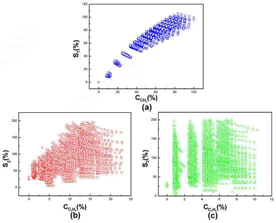 Because of the cross-sensitivity of the three kinds of gases to the sensors array, it is hardly possible to read the accurate concentration of each gas from linear system. The symbols used in the database are explained in Table 2, where is the input concentrations of the three gases, is the sensors’ output of gases’ concentrations, and is the MLP NN value at the output layer, which is the concentrations of the three gases after eliminating cross-sensitivity. S1, S2 and S3 are the sensors’ output of methane, ethane and propane, respectively. The error represents the average error between sensors’ output and MLP NN output. Figure 6 shows the cross-sensitivity of the three sensors to the three kinds of gases before using MLP NN. The X-axis represents the accurate concentrations of the three gases methane, ethane, and propane, respectively. The Y-axis represents the measured concentration from three sensors. Figure 6a–c shows the response of each sensor to its corresponding gas in three mixed gases, as S1 vs. methane, S2 vs. ethane, and S3 vs. propane, respectively. We can see from the figure that the sensors have deep cross-sensitivity to the other two gases. Therefore, it is difficult to recognize the concentration of each gas in this case.